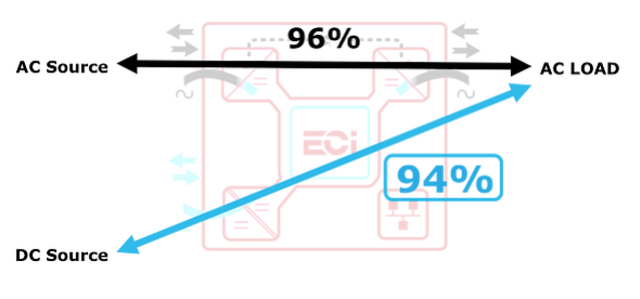 ECI は 94% の絶縁型 DC/AC 変換効率を提供します。これは市場で最高です。また、入力力率が 1 で、96% の AC/AC 変換効率を提供します。