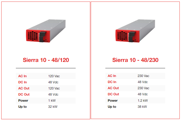 Sierra 10 パワー コンバータは、UPS またはインバータを必要とする 5G 展開、セル タワー、屋外エンクロージャ、およびポータブル電源アプリケーションに最適です。