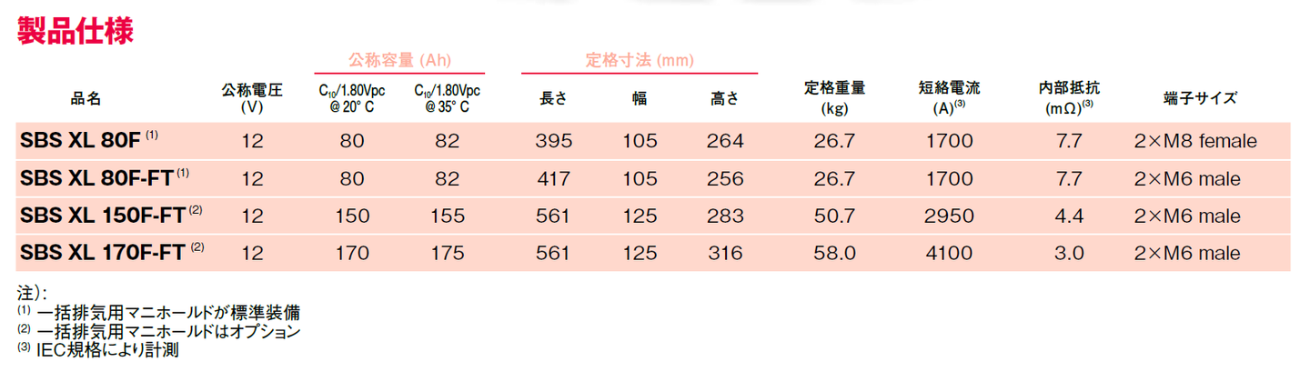SBS XLは、携帯電話基地局バックアップ用に開発した、高温寿命特性に優れた最新のSBS XLシリーズ